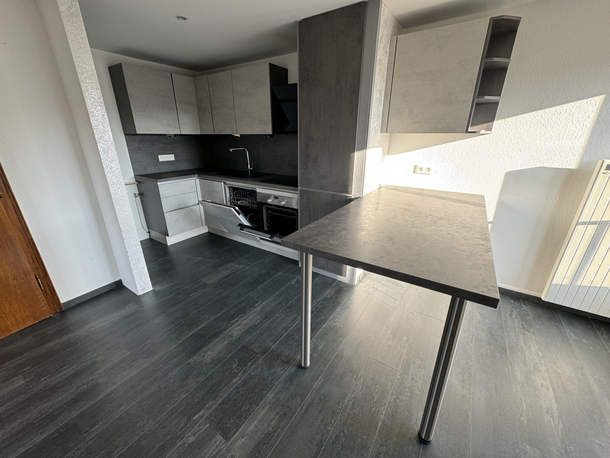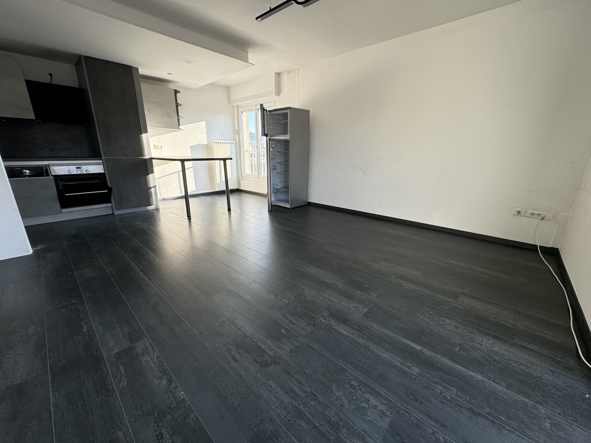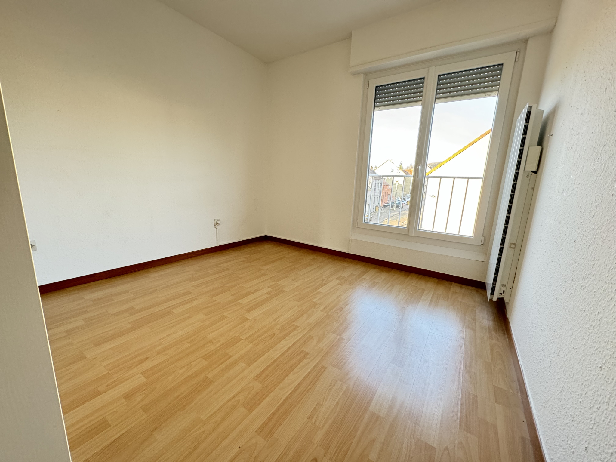 Appartement type F3 au deuxième étage d'un immeuble calme, avec deux chambres, entrée avec placards, salle de bain (baignoire) et WC séparés, séjour avec cuisine ouverte et un petit balcon sur rue.
