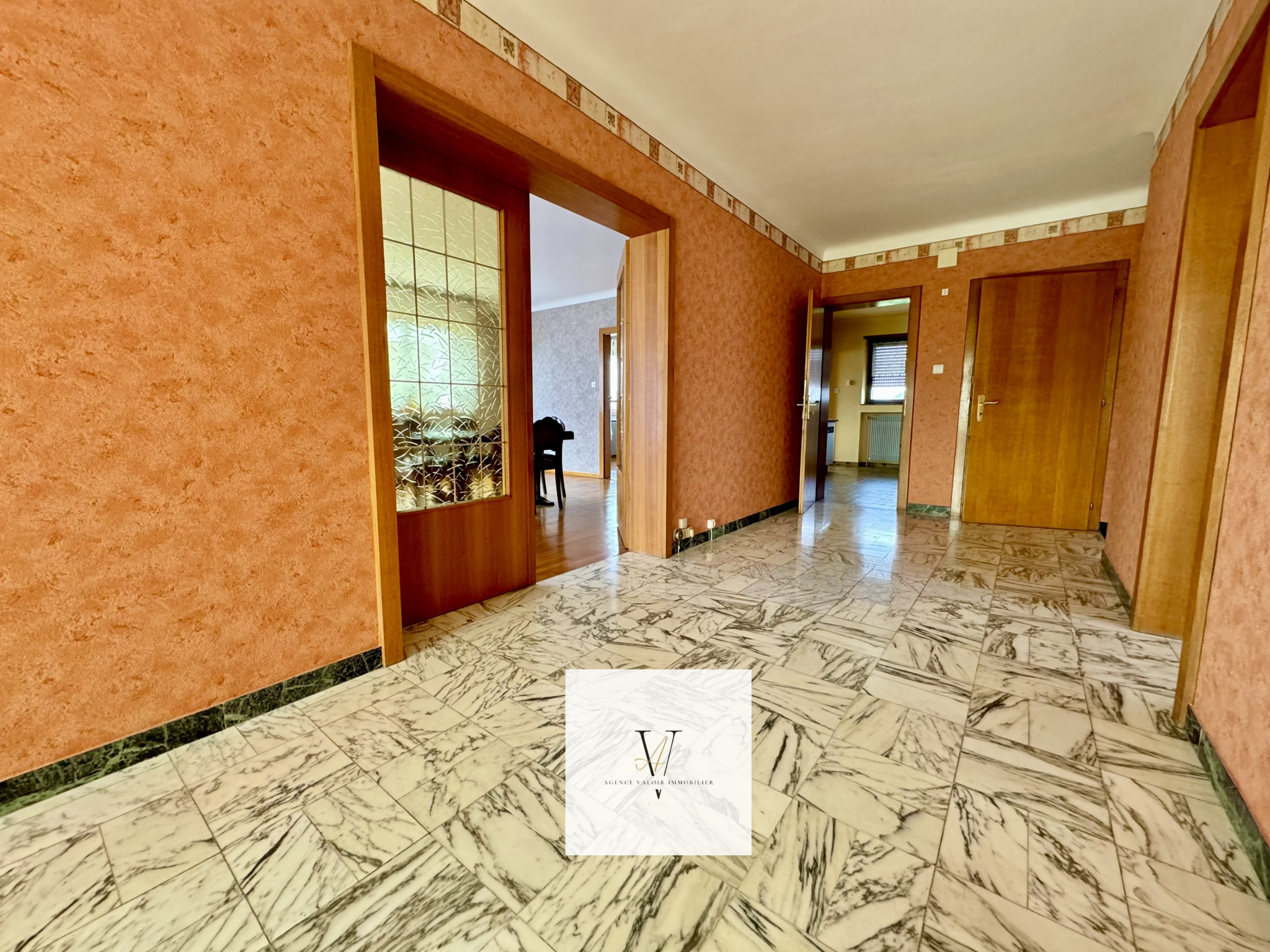 Une grande entrée qui donne sur 3 chambres sur la droite, une salle d'eau, WC séparés, très grand séjour, salle à manger et cuisine