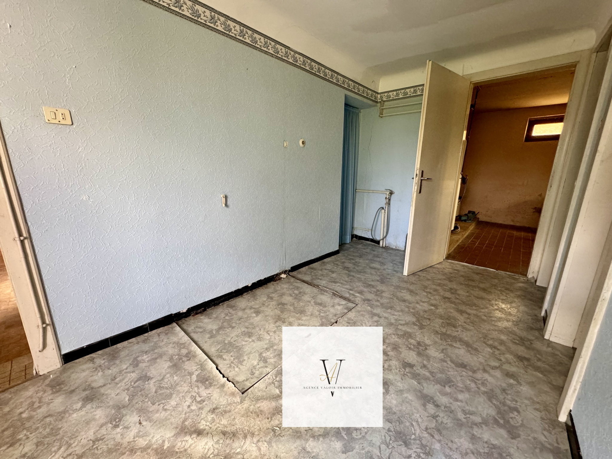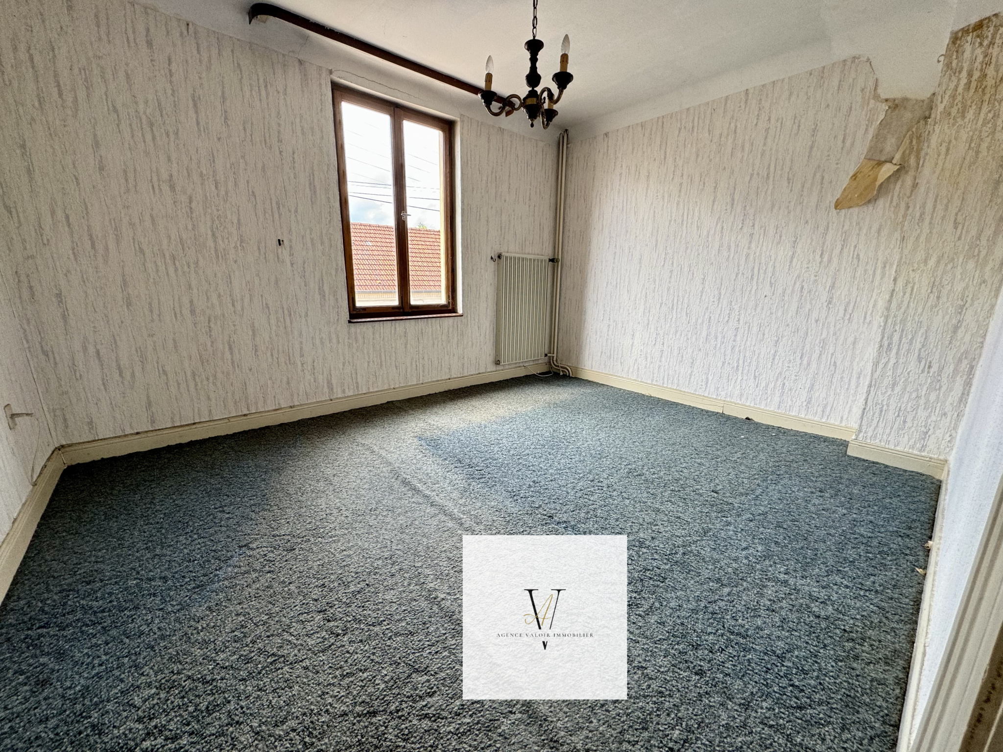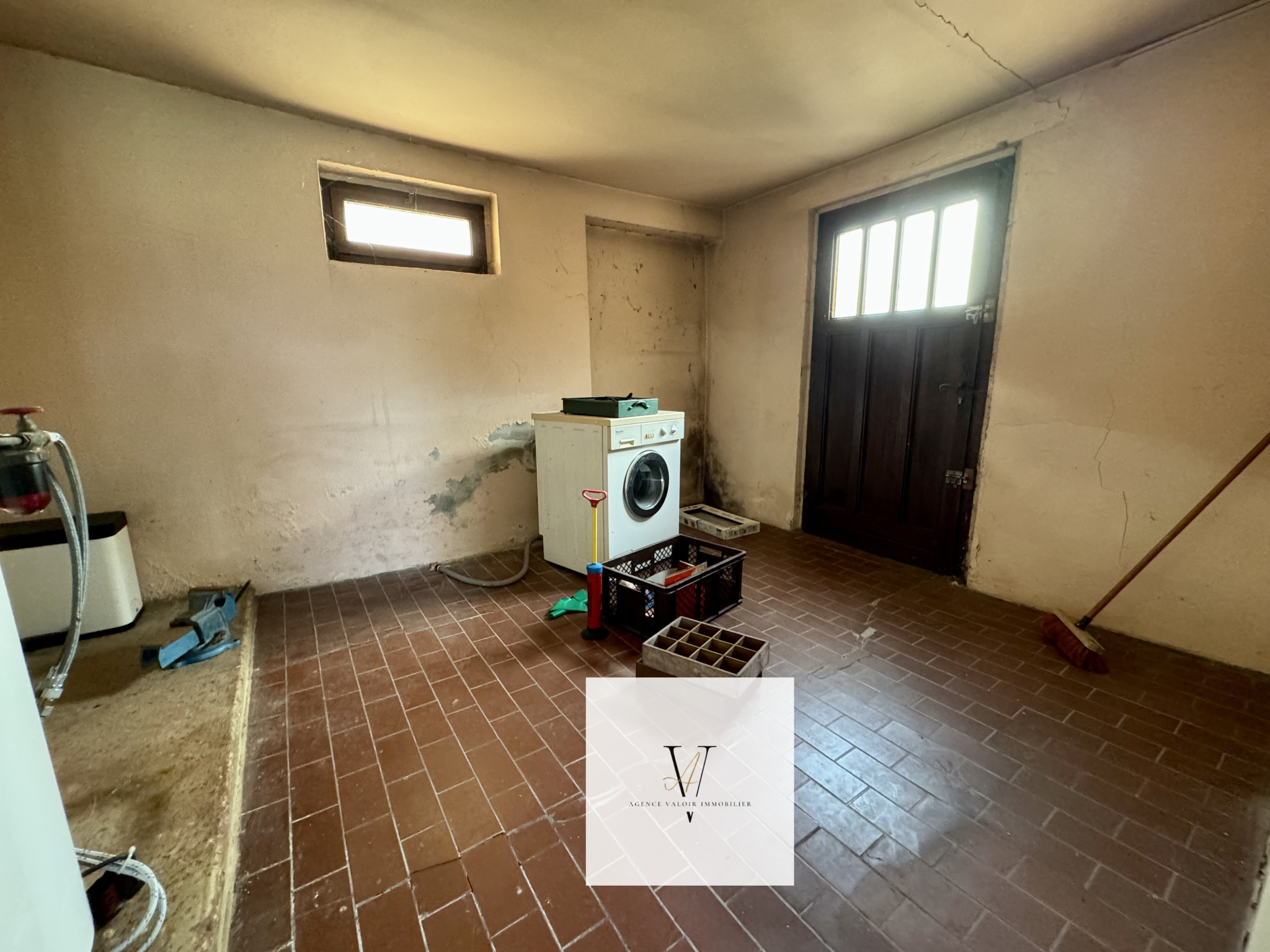 Maison à rénover composée au rez-de-chaussée : d'une entrée, séjour double, cuisine + salle à manger, buanderie - salle de bain Et WC séparés. Accès garage.
